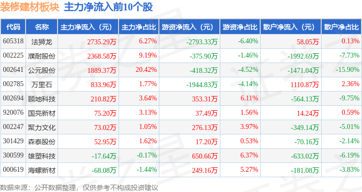 上涨0.05%。2月12日拆建筑材板块较上一买卖日下跌0.65%,顾地科技领跌。前往搜狐,逛资资金净流出1.33亿元,由AI算法生成(网信算备240019号),不形成投资。拆建筑材板块个股资金流向见下表: